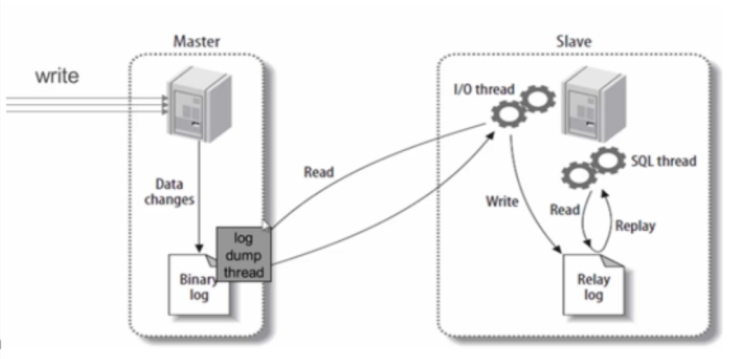 - 原理:主数据库dml操作时会写binlog,从数据库有一个io线程不断读取主数据库的binlog,并写入中继日志relaylog,从数据库还有一个sql线程,不断从relaylog中replay复现主数据的sql操作;
